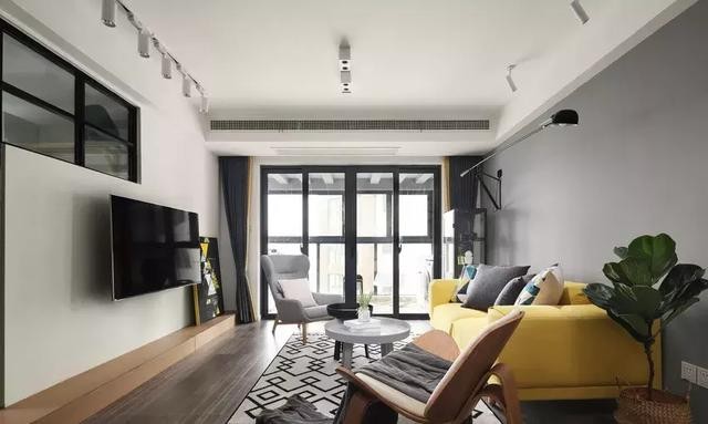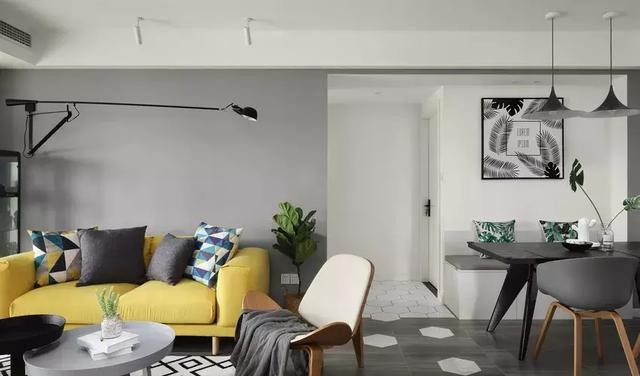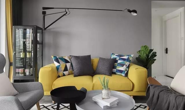 ▲客廳是設計最棒的地方,用白色和灰色來打底,再搭配亮黃色的布藝沙發,太溫馨。