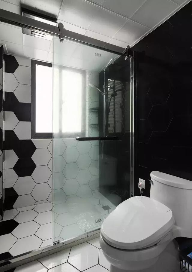 ▲衛生間采用黑板搭,白色帶來清爽,黑色顯穩重,玻璃門和防水臺把干濕分離做得很到位。