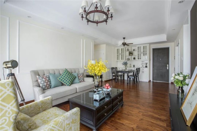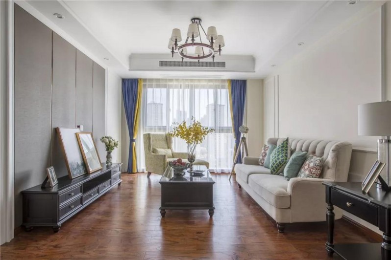 米色沙發背景搭配同色系的沙發,點綴幾個清新淡雅的抱枕,原來美式也可以有小清新的一面。高純度的藍色&黃色窗簾,成為整個空間的亮點。