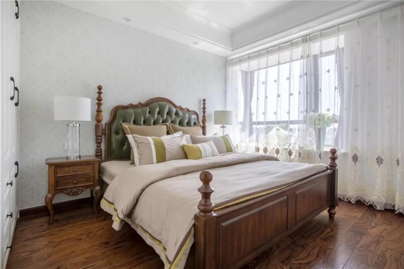 臥室以木紋色為主色調,荷葉綠做點綴,高雅又奢華。但在淺色系墻面的襯托下,卻更顯得穩重、性感又低調。